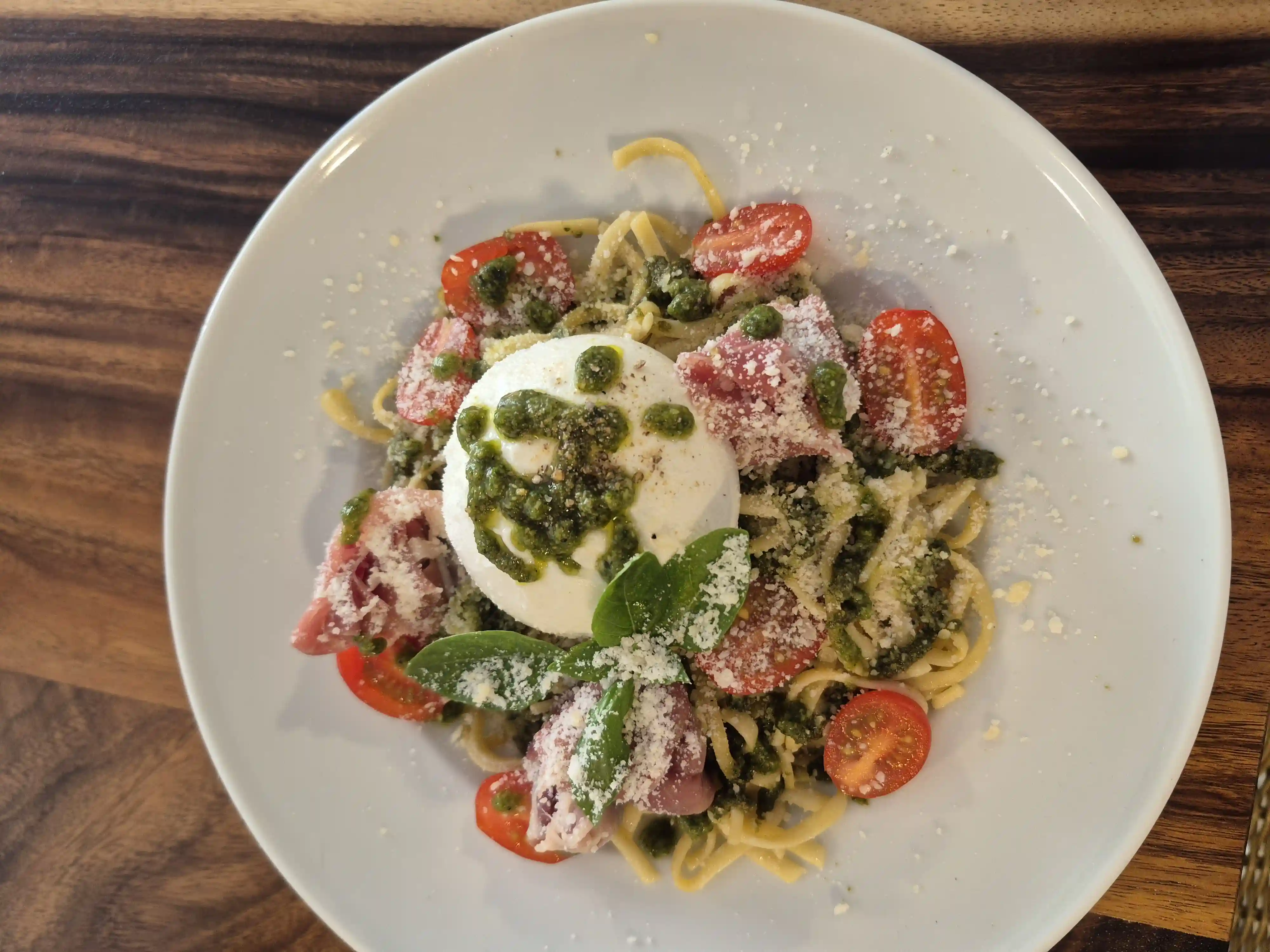 Pain Artisanal, Steak Angus, Tomate, roquette, pesto, Jambon Sec, Mozzarella