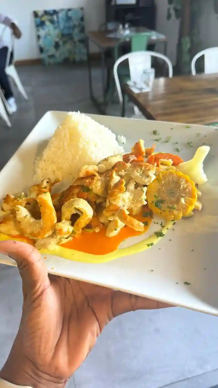 Plat Signature du Restaurant, une Banane Plantain Farcie à la Chiquetaille de Morue, Coulis de Poivrons Rouge au Lait d…