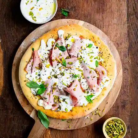 Crème fraiche, mortadelle, stracciatella, pistache, mozzarella, olive, origan