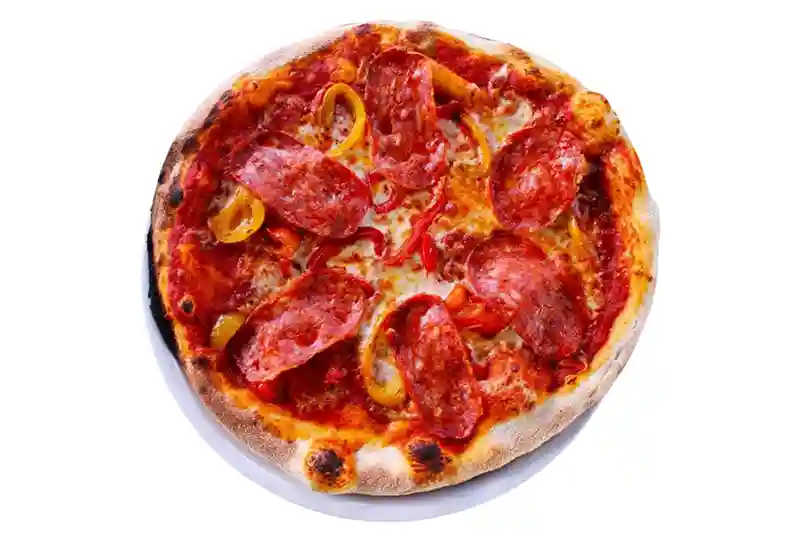 Sauce Tomate, Pepperoni, Poivron, Oignon, Piment d'Espelette, Mozzarella, Olive, Origan