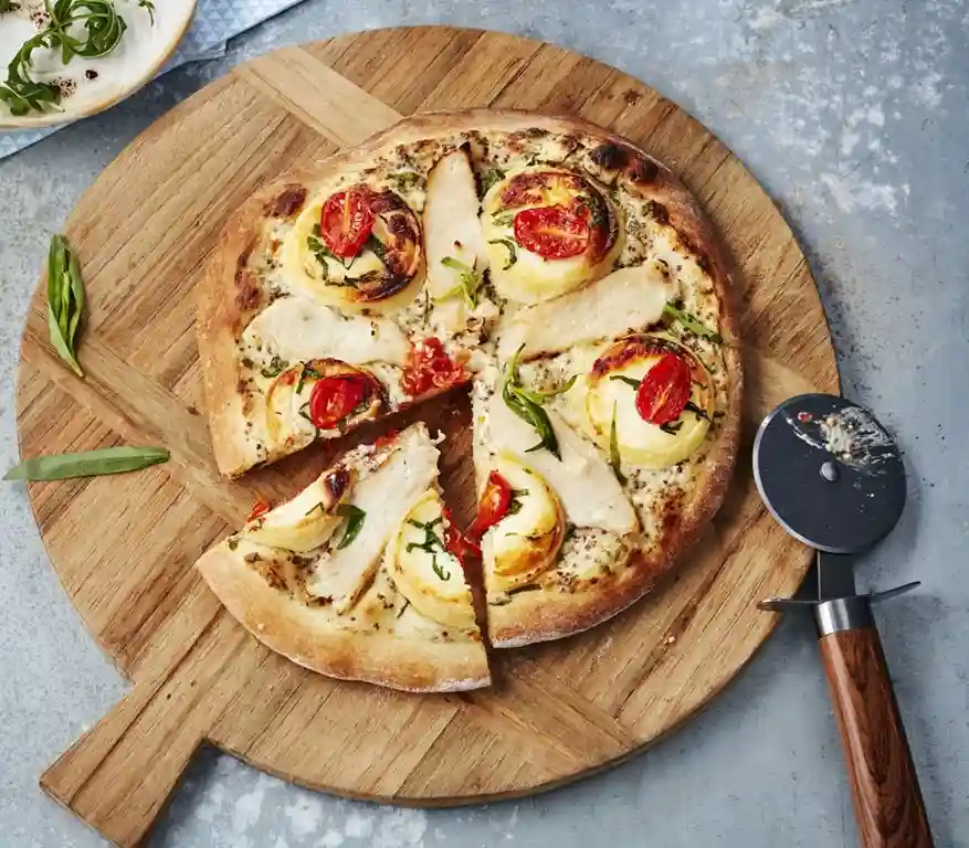 Base crème, Mozzarella Poulet, Fromage de Chèvre, Tomates cerises, Oignons, Miel