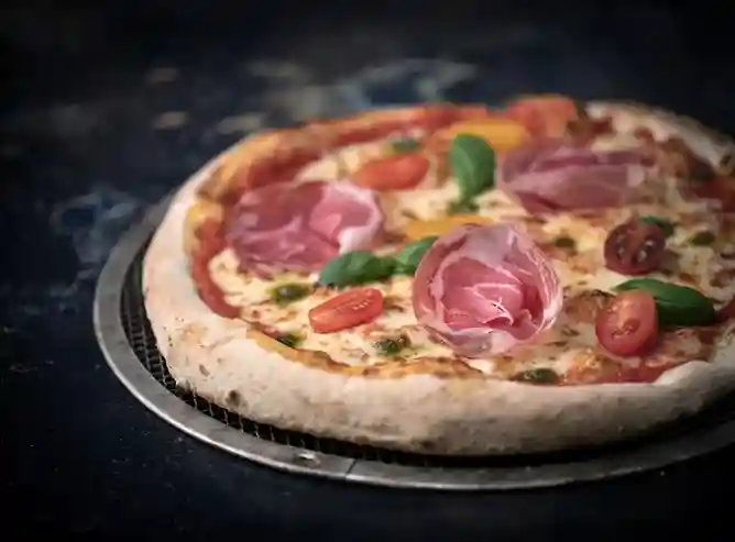 Sauce Tomate, Jambon Cru Italien, Tomate Cerise, Roquette, Parmesan, Pesto, Mozzarella, Olive, Origan