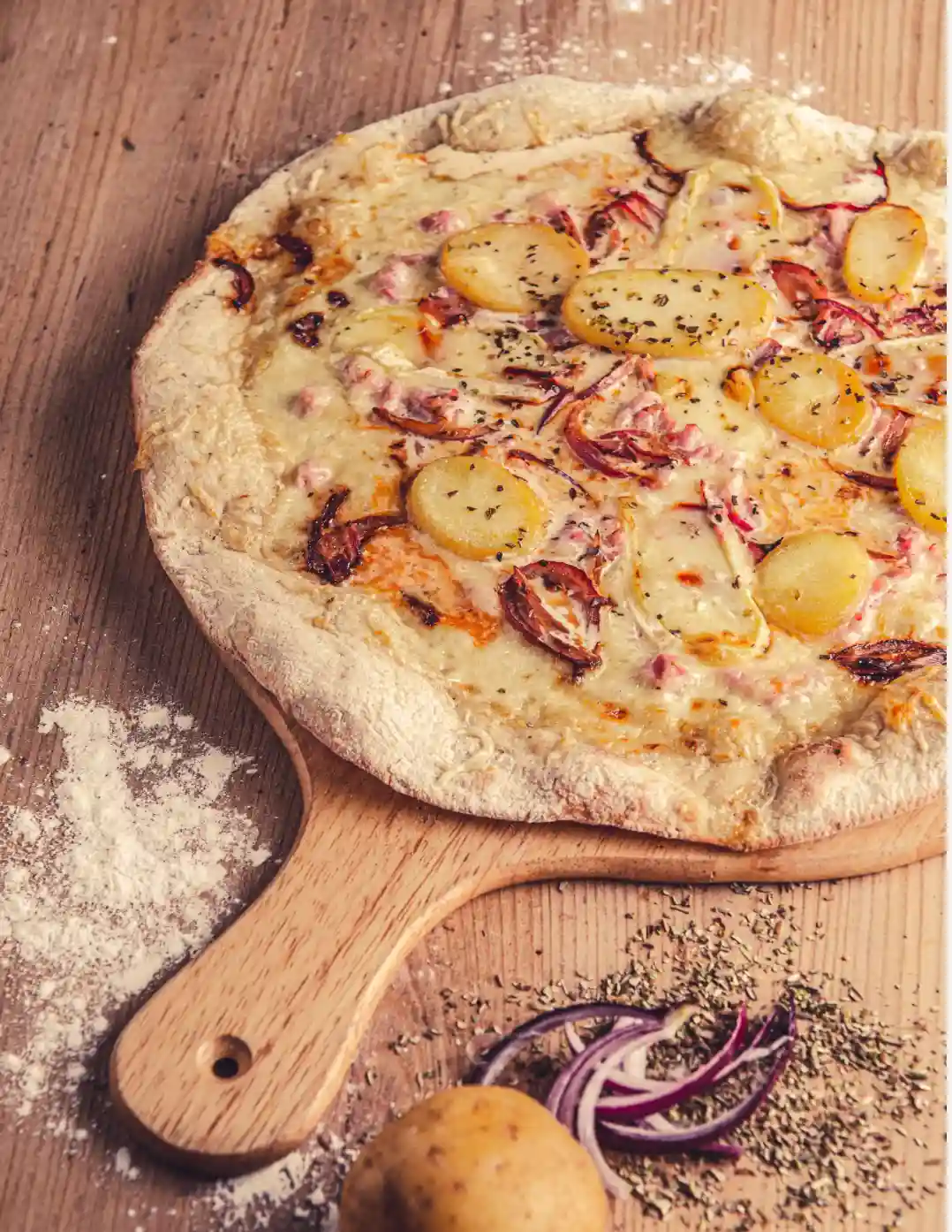 Crème, mozzarella, reblochon, lardons , pomme de terre, oignons caramélisés, origan
