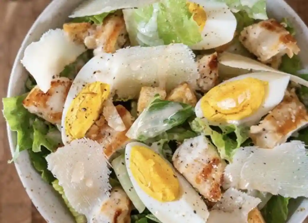 Salade romaine, croutons, tomates cerise, oeuf dur, copeaux de parmesan, sauce Caesar aux anchois
