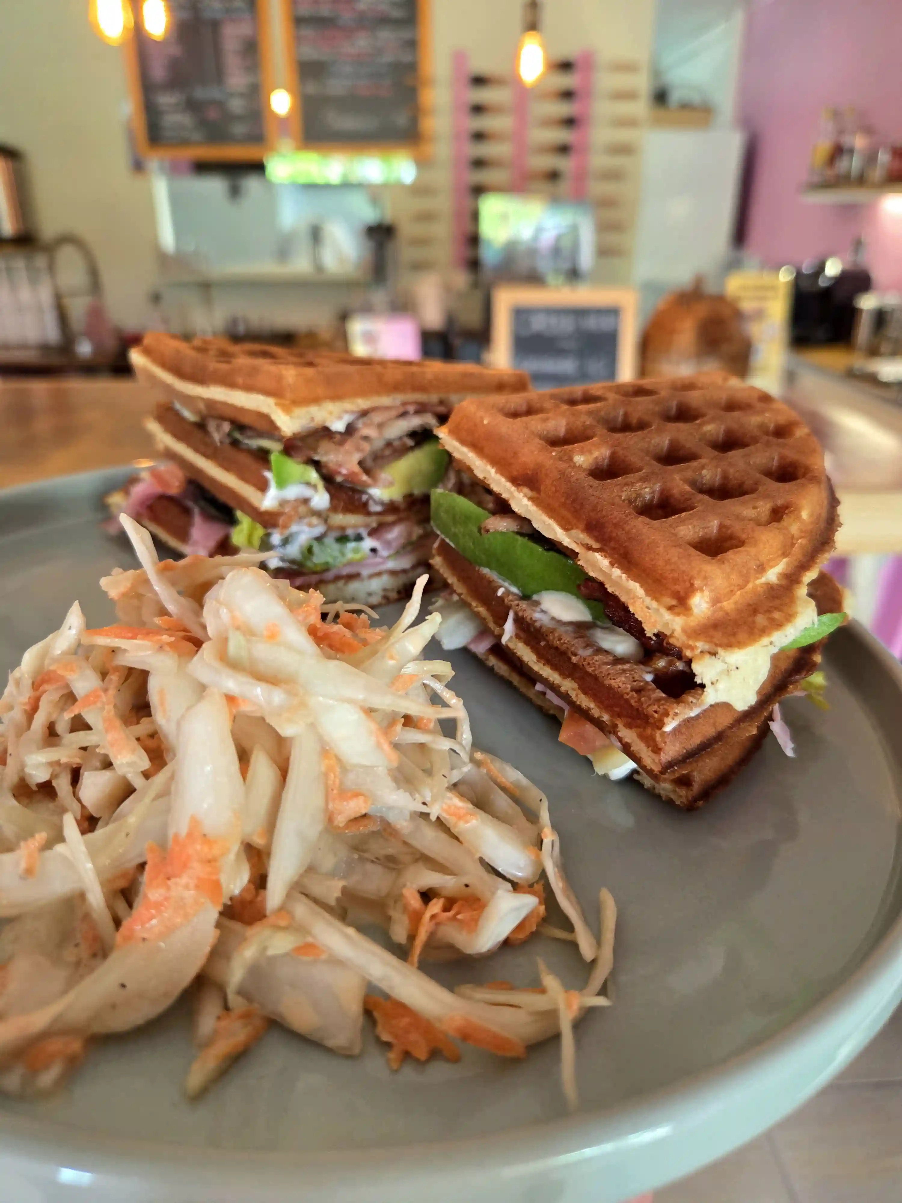 Gaufre fine garnie d'avocat, poulet jerk, bacon, jambon, tomate, salade, fromage & coleslaw