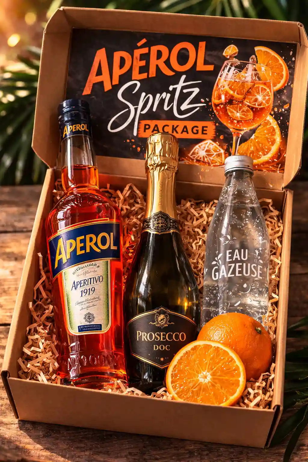 1 Bottle of Aperol, 1 Bottle of Prosecco, 1 Bottle of Sparkling Water, 1 Orange