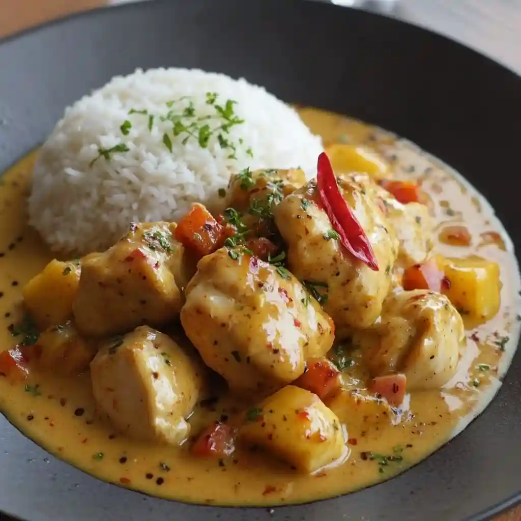 Escalope de Poulet, Crème liquide, Champignons, oignons, vin blanc, sel et poivre