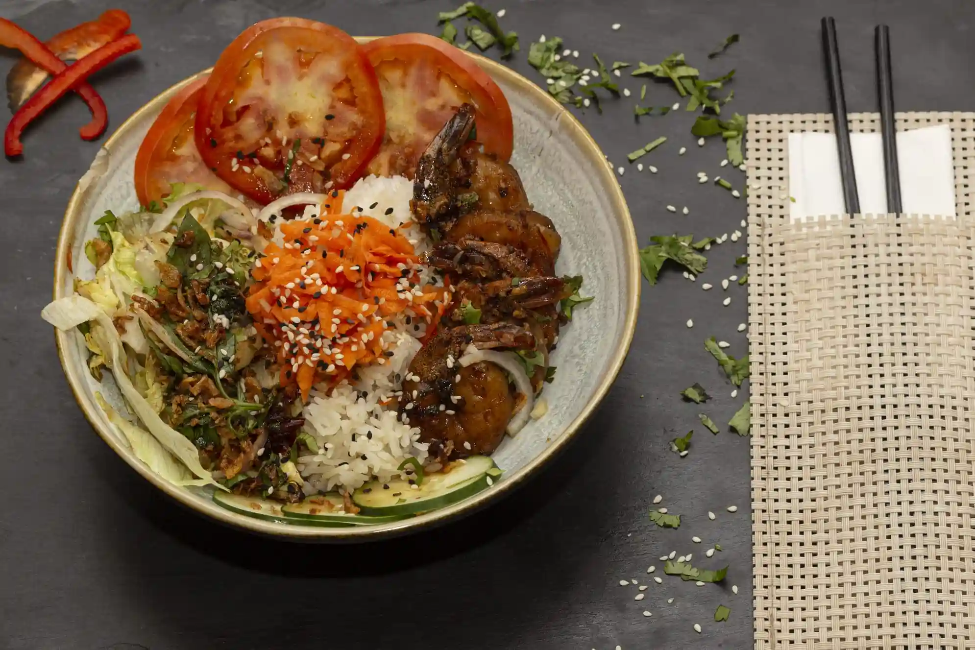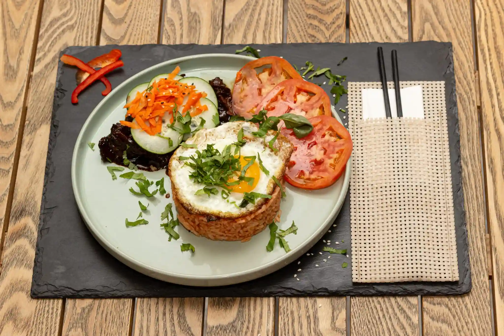 Boeuf mariné dans la sauce Tuktuk et sauté à l'ail, Riz frit aux tomates, Concombre, Tomate Fraiche