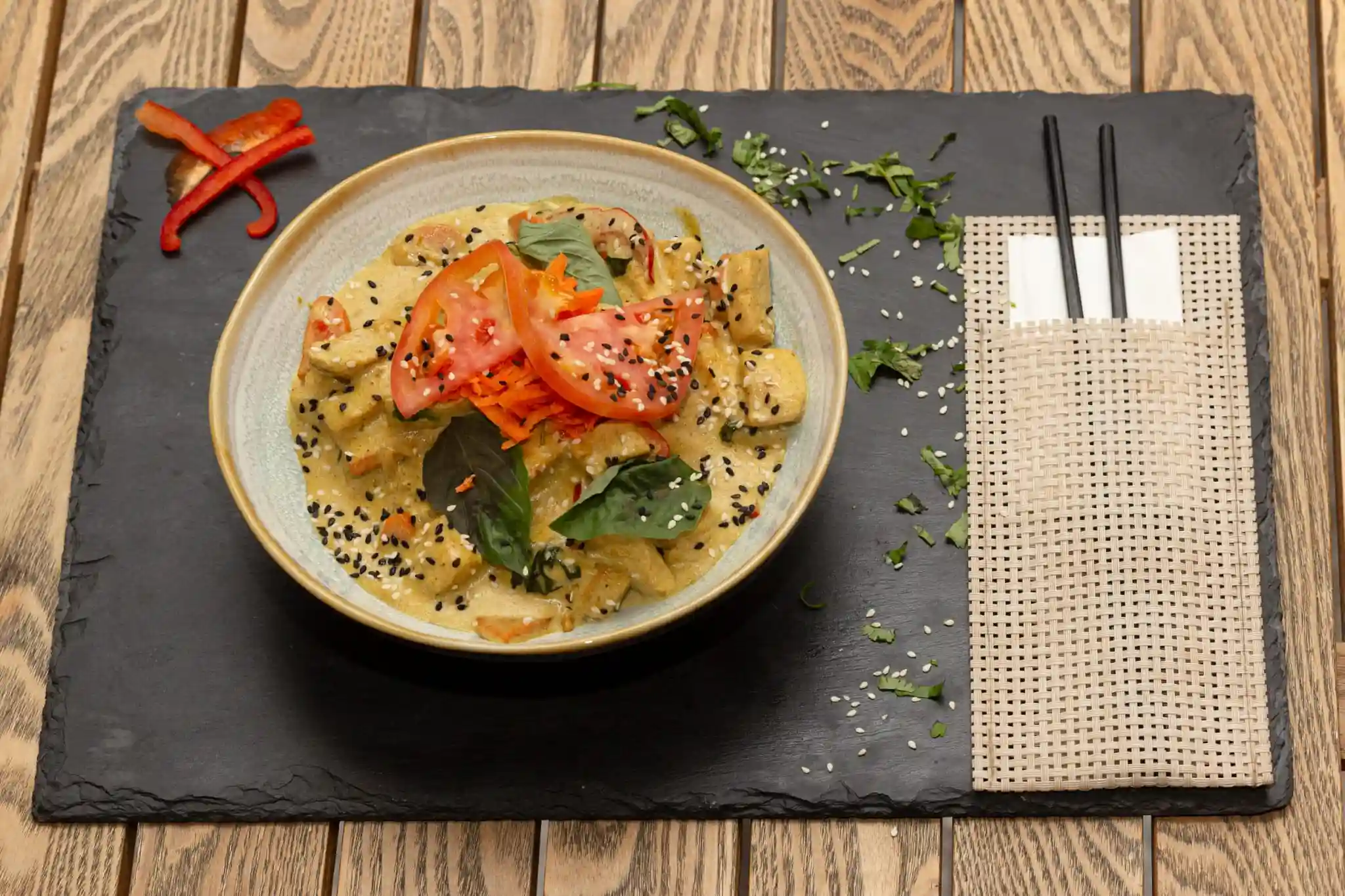 Poulet dans son jacuzi de curry vert au lait de coco agrémenté de carotte et courgette, servit avec du riz jasmin