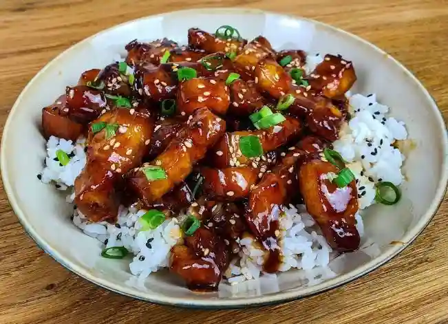 Porc au caramel recette traditionnel de Saigon, Subtil touche cantonaise avec les pousses de Bambou, Servit avec du riz…