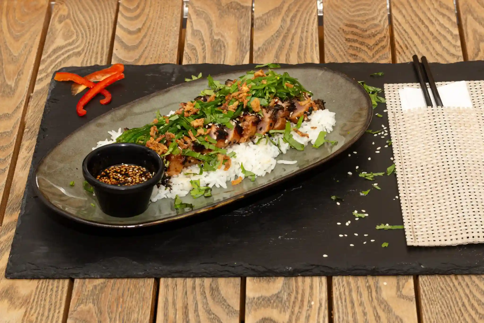 3 gyoza, 2 nems, 2 samoussas, brochette poulet & porc yakitori, riz jasmin