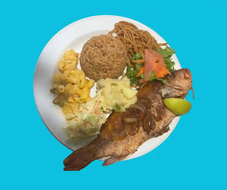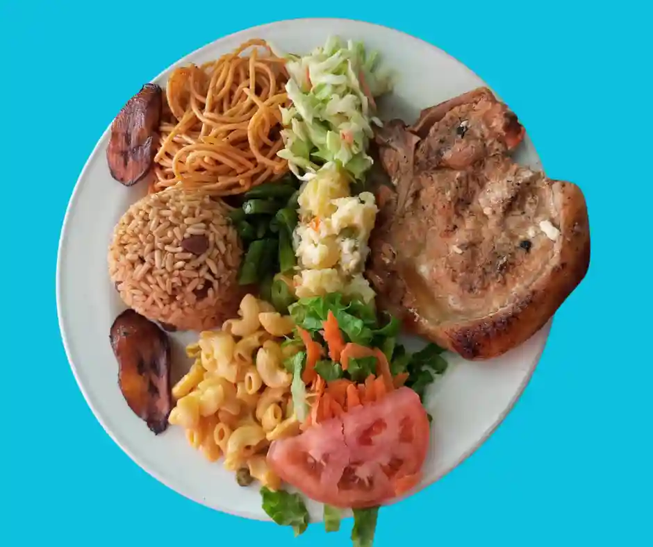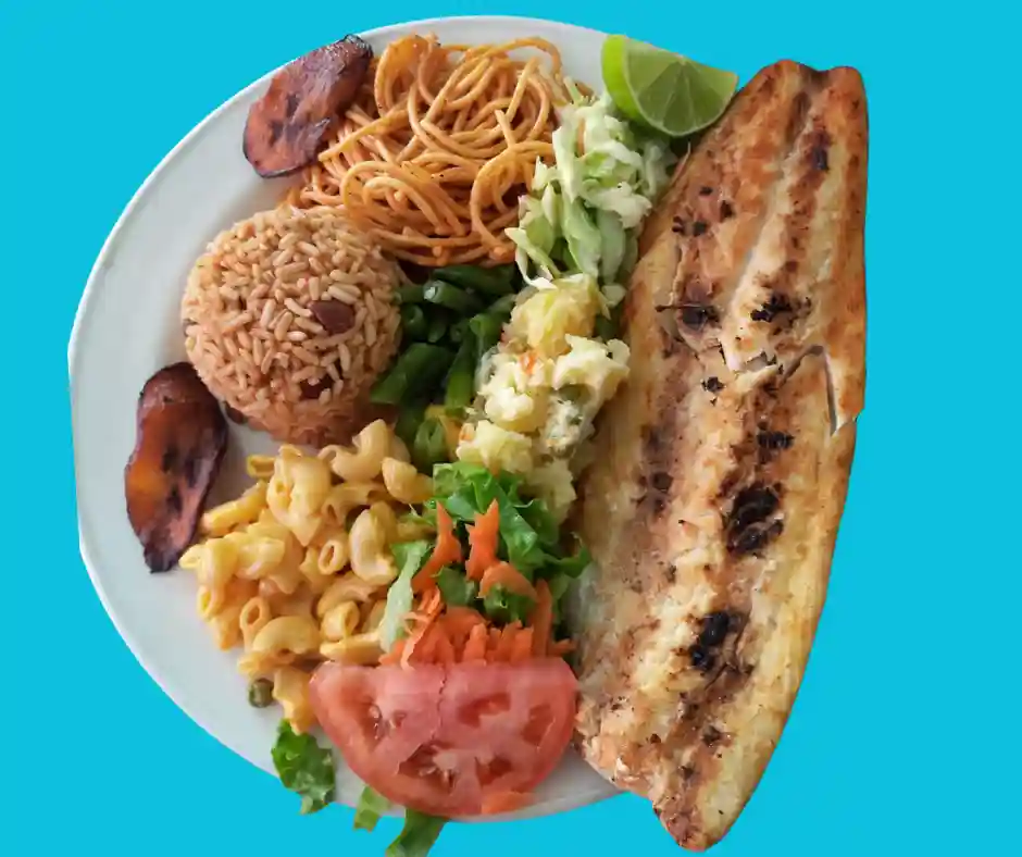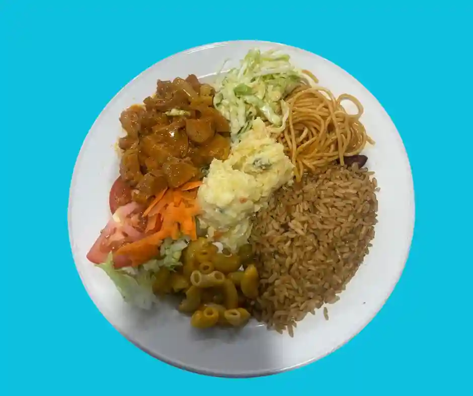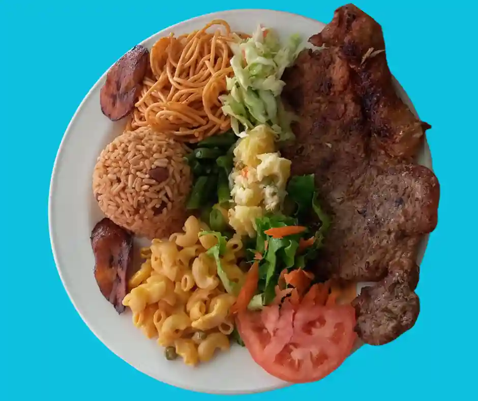 Tout les plats sont accompagnés de riz aux pois, salade verte , salade de pomme de terre, plantains, coleslaw, pois vers, macaroni au fromage et spaghetti