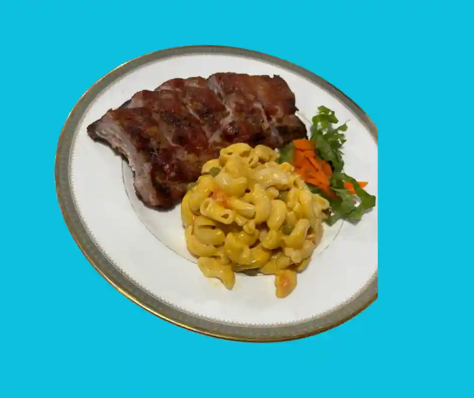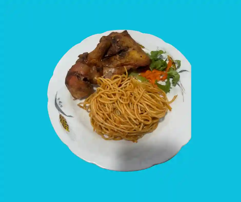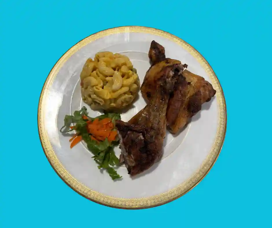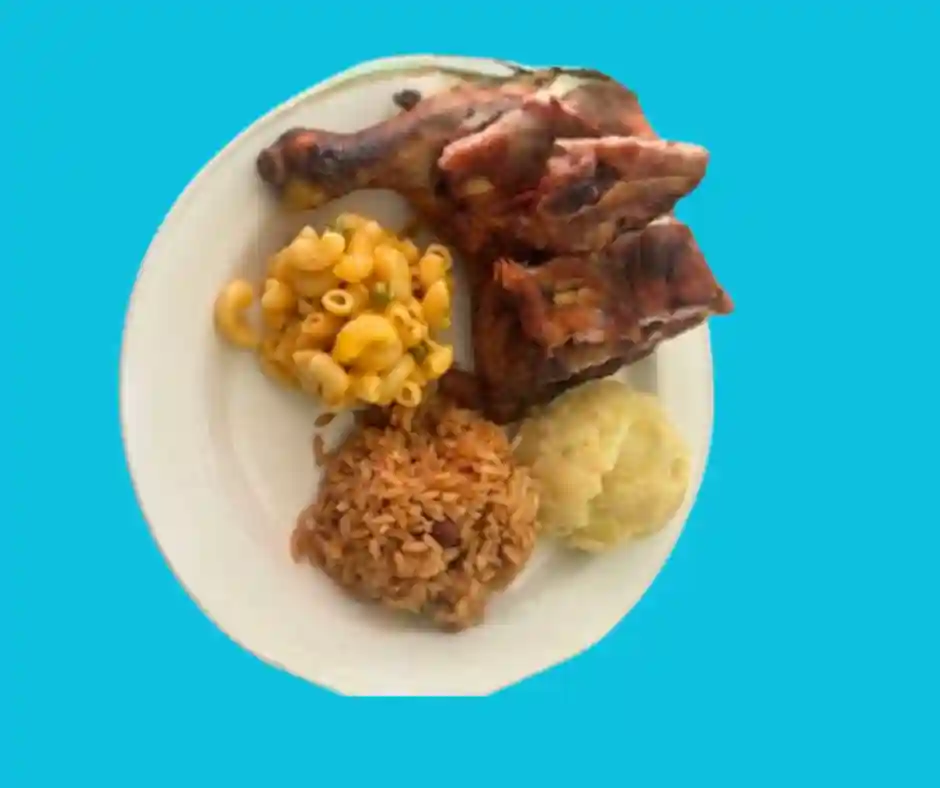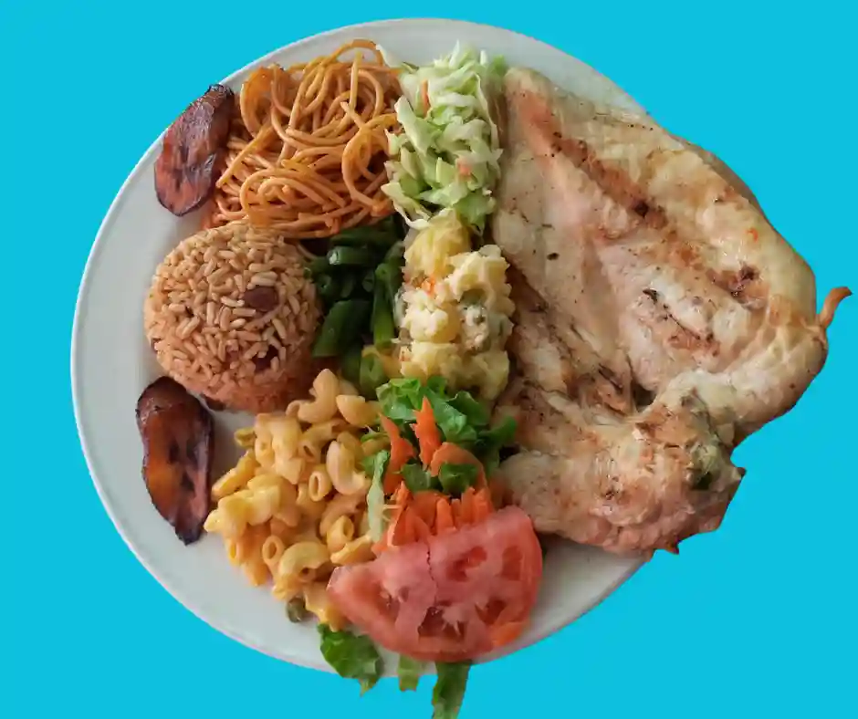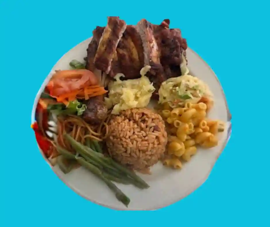 Tout les plats sont accompagnés de riz aux pois, salade verte , salade de pomme de terre, plantains, coleslaw, pois vers, macaroni au fromage et spaghetti